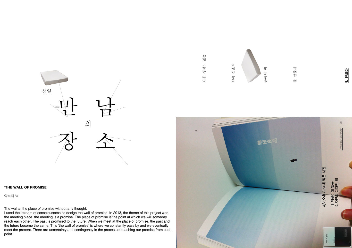 In 2013, the theme of this project was the meeting place. the meeting is a promise. The place of promise is the point at which we will someday reach each other. The past is promised to the future. When we meet at the place of promise, the past and the future become the same. This 'the wall of promise' is where we constantly pass by and we eventually meet the present. There are uncertainty and contingency in the process of reaching our promise from each point.